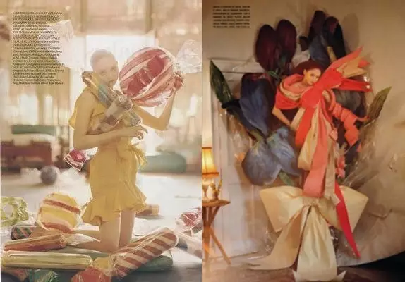 Tim Walker的世界是这样的:到处是明亮、温暖、古典、童真、魔幻的气息,故事常常发生在花园、桃树、古城堡、原野、溪流边,以及展览室里,道具有玩偶、五彩的猫、白马和紫色的马、五颜六色的气球、花瓣、流星雨,以及一切繁复而华丽的小配饰——那些部分来自我们的梦境,部分来自祖母在我们小时候讲述的神话。听起来像是爱丽丝梦游仙境(Alice in Wonderland)的场景吗?