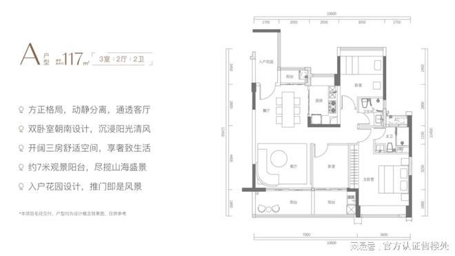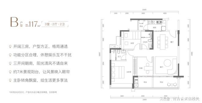 B户型为开阔三房设计,户型方正、格局通透,空间舒展,功能分区科学合理。客厅连接宽约7m的宽幅景观阳台,南向可望蔚蓝大海与晴空万里,景观面极佳
