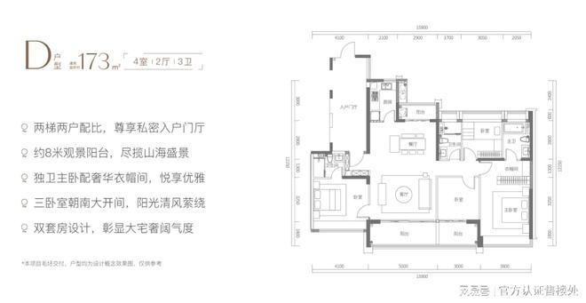D户型为尊贵四房三卫设计,三卧室南向海景大开间,采用双套房配备私属卫浴设计,主卧配备专属奢华衣帽间,居住体验更为奢华。
