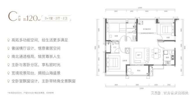 C户型高拓多功能空间,户型方正,格局南北通透,采用开间约7m的奢阔横厅设计,南北两侧宽境双阳台设计,将海景、山景拉满客厅、餐厅,映入整个室内功能区。